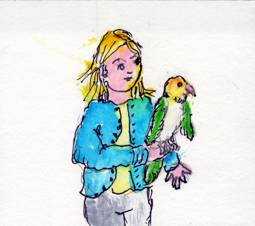 A woman came up to me with a medium sized parrot on her shoulder. As a child, I had ducks. My mother had turkeys and geese… I had raised a nestling bird one summer to adulthood. I have had a positive time with birds. We have geese and ducks in a pond at our home now. The woman asked me if I wanted to hold her parrot. Hesitant, I said “Yes.” It hopped onto my index finger.