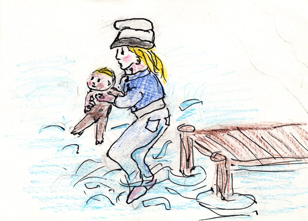 I would have signed up for the Marines at that time in my life. I was young, strong, and stealthy. I could swim! Teaching took away my fear of sharks. Raising children took away my fear of death. My daughter was letting her boyfriend into her room at night by letting him in through her window. I found where she kept her little notes to him, and that taught me about information gathering. I paid as much in daycare as I made. I took the kids to my mother’s house on the beach. My mother made me battle tested. I heard her call out to me “Sharon, could you get the baby? He’s awake.” I went into the darkened bedroom. He was awake and naked. He had his diaper off and had diarrhea. He had had enough time to coat the walls, the inside of the crib, and all of himself in poop. I instantly grabbed him and ran down the beach to the end of the dock and jumped in with him. I would have made a good Marine. There should be a unit of Marines called Mad Menopausal Moms. My mother would have signed up that day despite her age. God help the recruitment person who would tell her no.